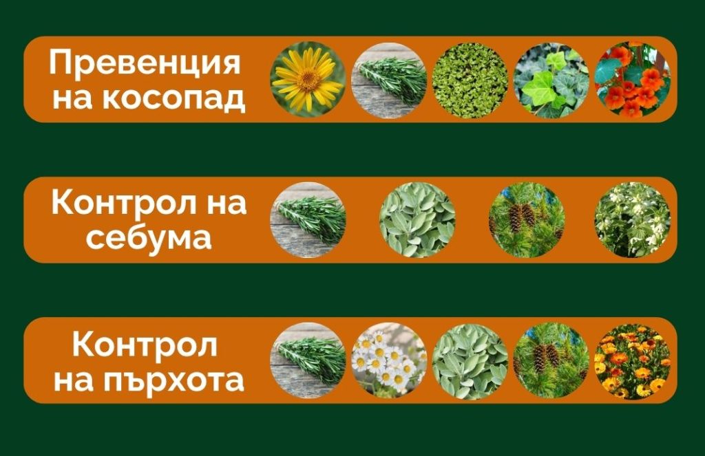 За контрол на пърхота: Розмарин, лайка, салвия, бор, репей, невен и бяла мъртва коприва